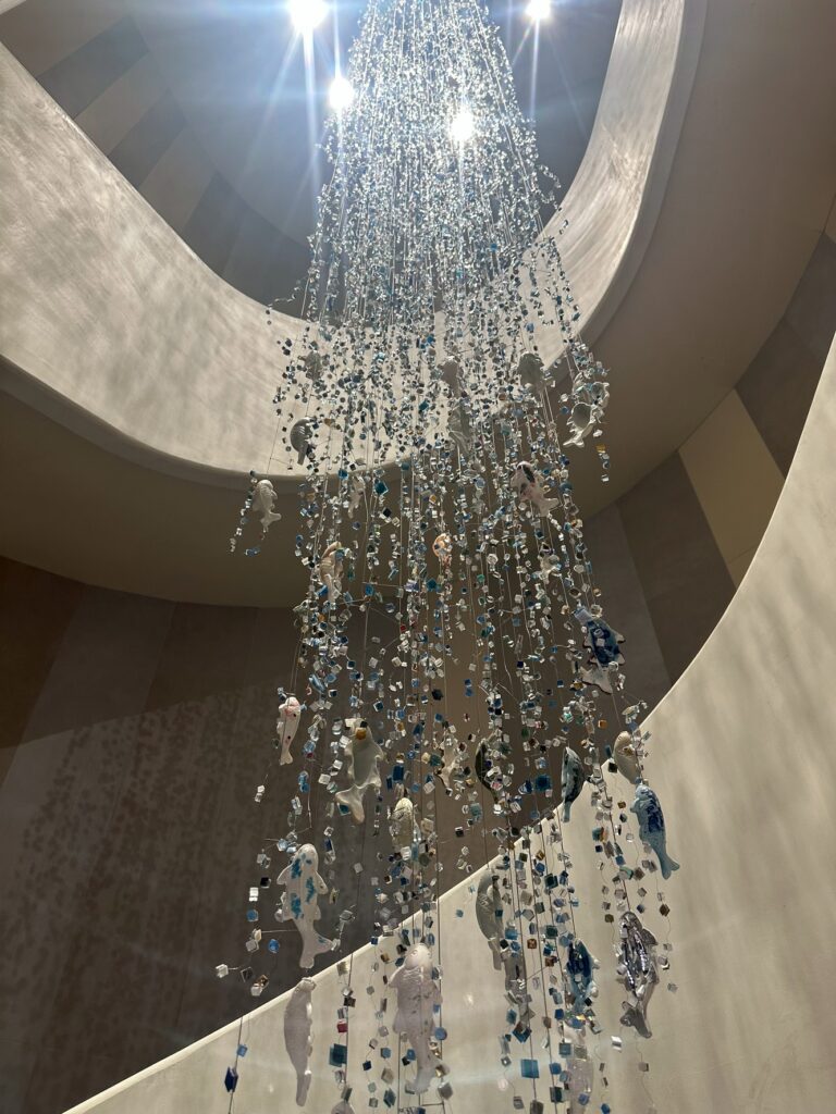 階段に設置されているシャンデリアのようなオブジェがとても印象的で、